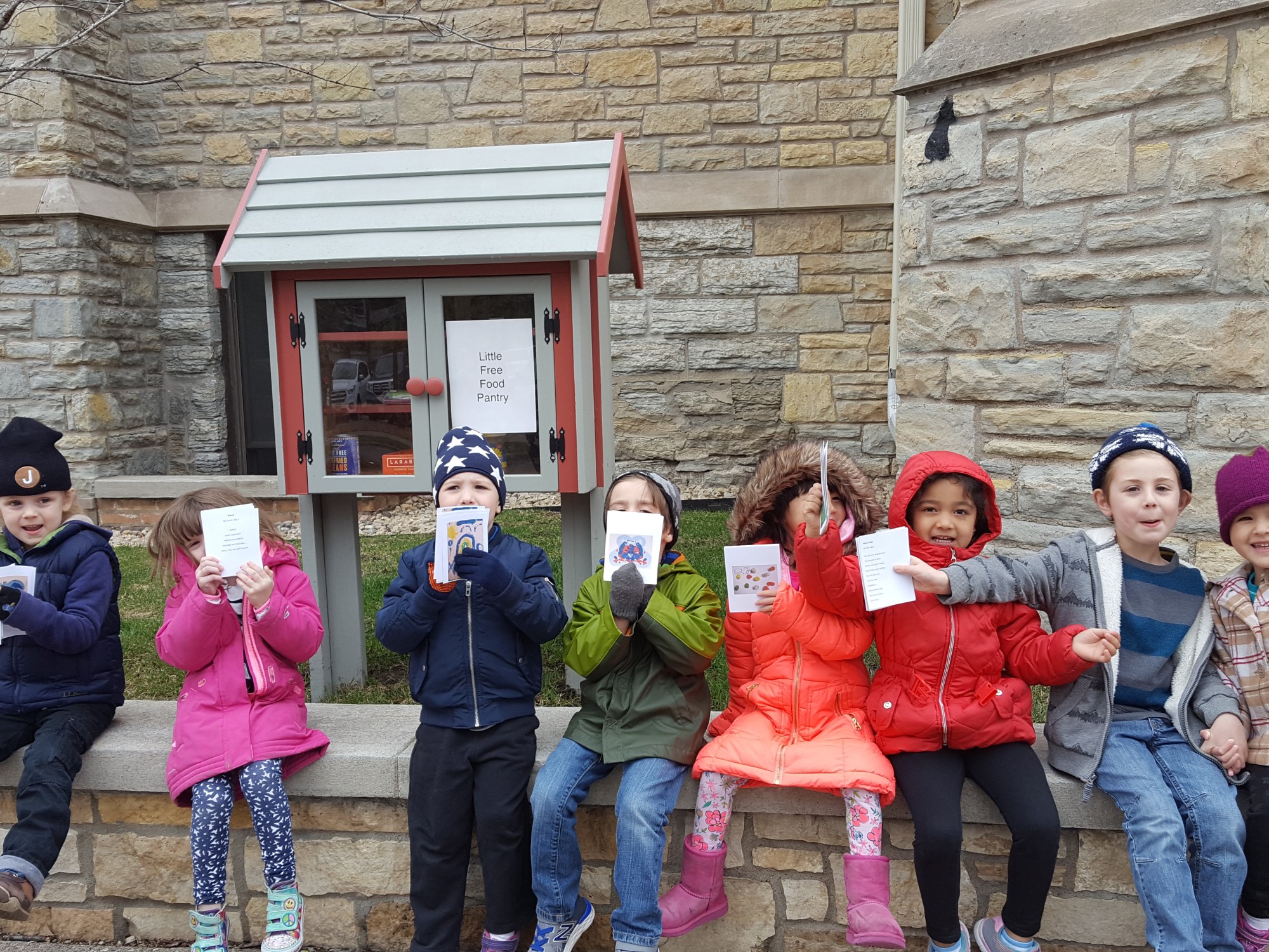 This is our third year celebrating Poem in Your Pocket Day at Grace. The first time we set out, one of the kids said, “I wonder if babies like poems?” and sure enough a mother turns the corner with a stroller. A couple kids approach her, ask if they can give her baby a poem. And of course the baby takes it, holds it tightly in her hand. Then as boy says, I wonder if dogs like poems too. And as you guessed, we encounter a dog who comes to work with the architect around the corner. And the dog holds that poem in his mouth, sits and poses as the children gather round for a picture. It was his prize and he was not giving it up.