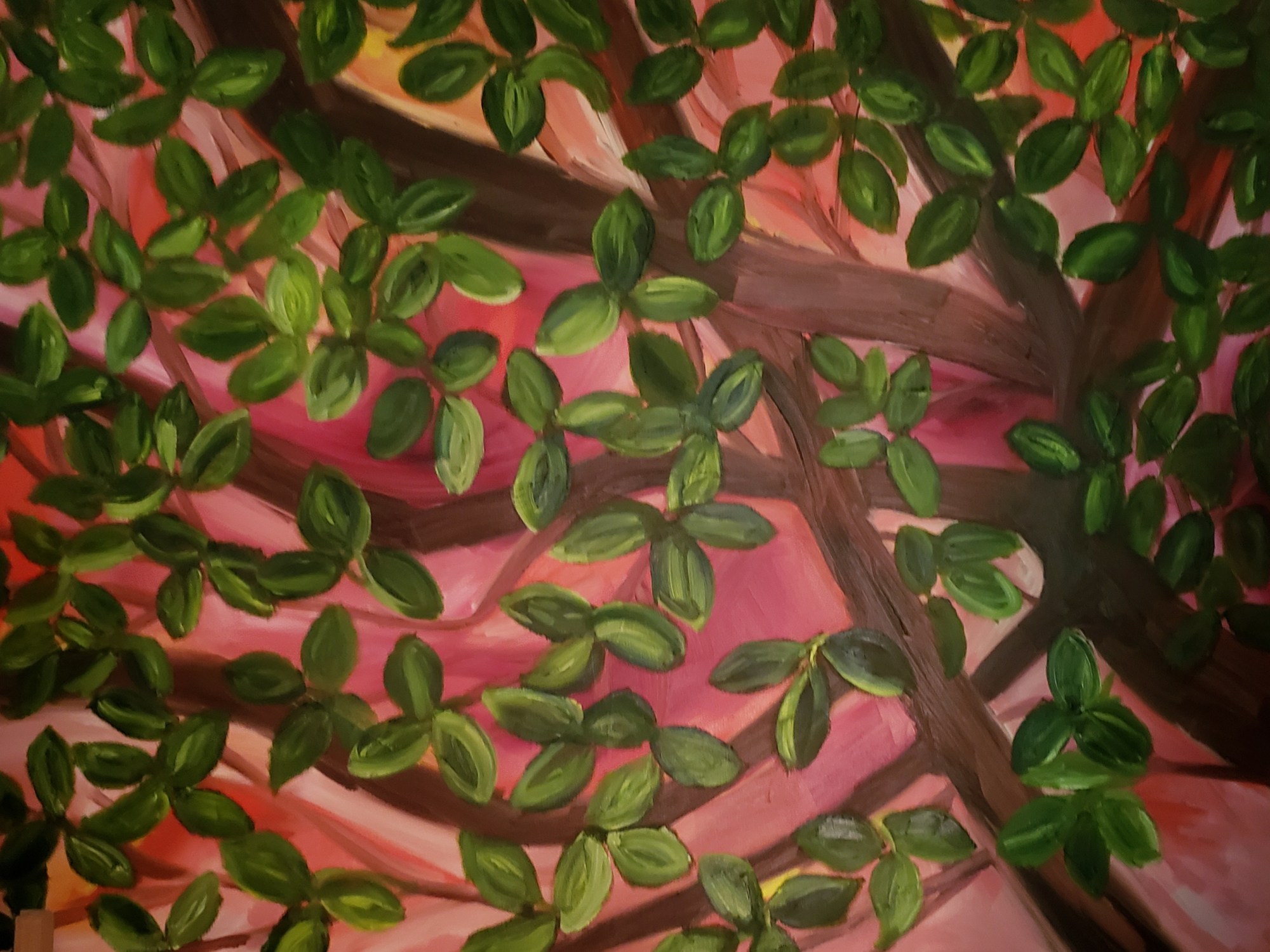 For my part of the show, I have been painting to untranslatable words. Meaning, words that we find in other languages, that we don’t have in english. The set of words I have chosen to paint to, all revolve around nature; heading outdoors, alone Waldeinsamkeit (German)or with company Samar (سمر) (Arabic) , to hear the birds sing Gökotta (Swedish), to sit and think Kukelure (Norwegian), to feel the wind Rokrassgat (Icelandic), to bath ourselves in forests Shinrin–yoku (森林浴) (Japanese), and notice how the sunlight moves through leaves Komorebi (木漏れ日) (Japanese).